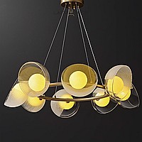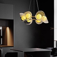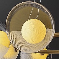 A series of ring chandeliers with creamy yellow spherical shades inside glass dome diffusers of different textures