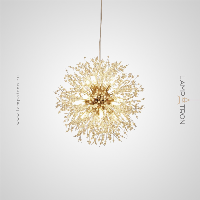 Designer chandelier in the form of a ball made of crystal beams with a metal center
