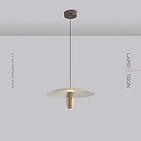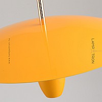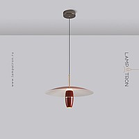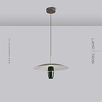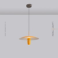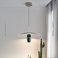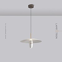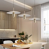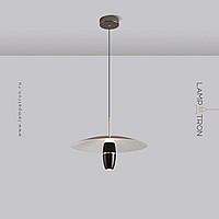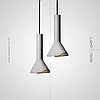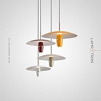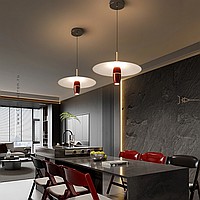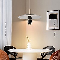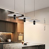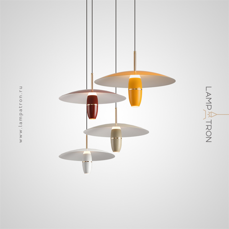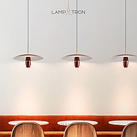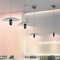 A series of pendant LED lights with a cylindrical spot under a disc-shaped lampshade
