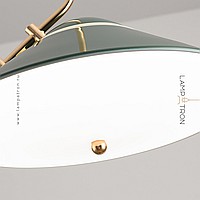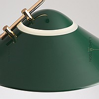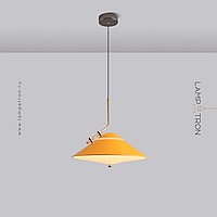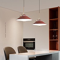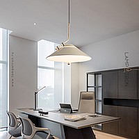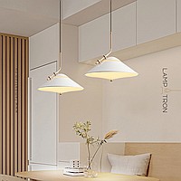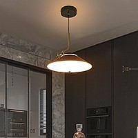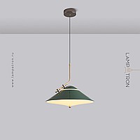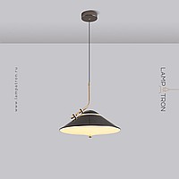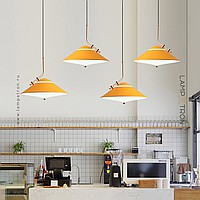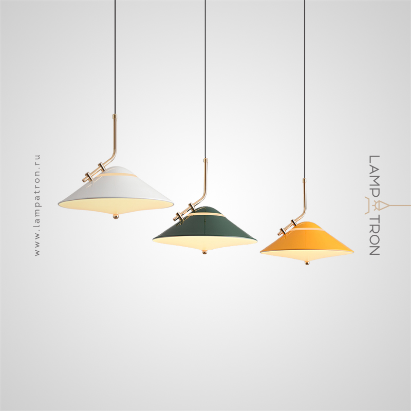 A series of pendant LED luminaires with a conical body on a corner mount in brass color