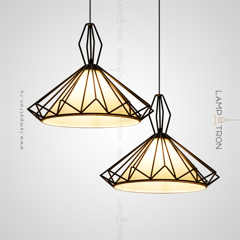 Suspended lamp with conical white plafon in a metal -shaped metal frame