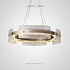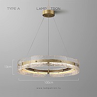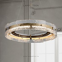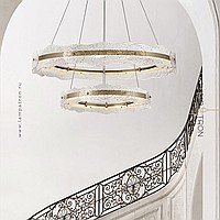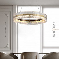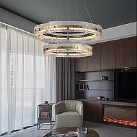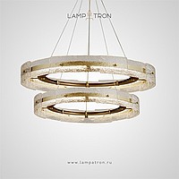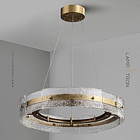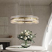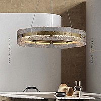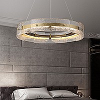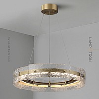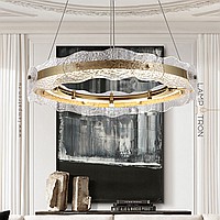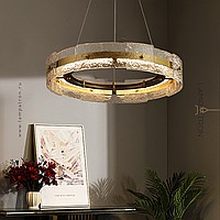 A series of ring LED chandeliers with a composite shade made of embossed glass plates