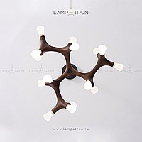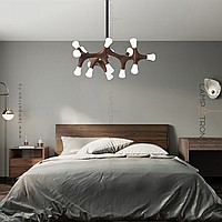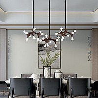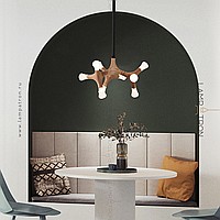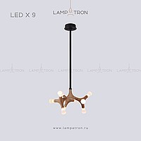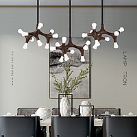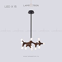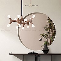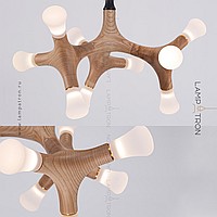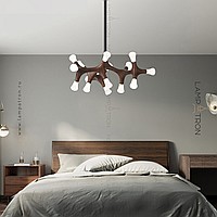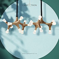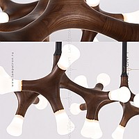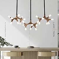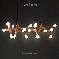 A series of designer lamps on ceiling racks with a frame of molecular wood and LED sources