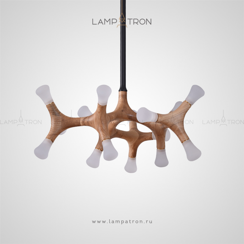 A series of designer lamps on ceiling racks with a frame of molecular wood and LED sources