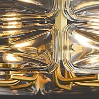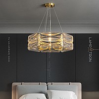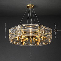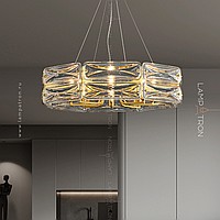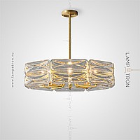 A series of designer chandeliers on a radial frame with rectangular scattered glasses