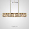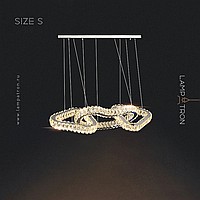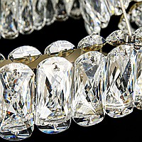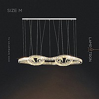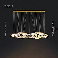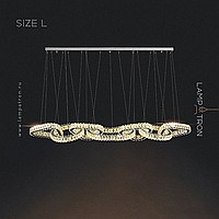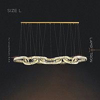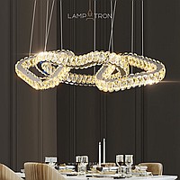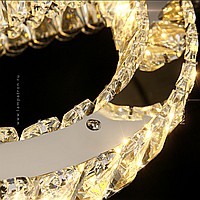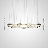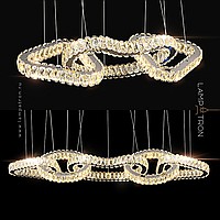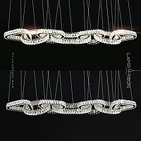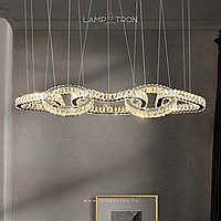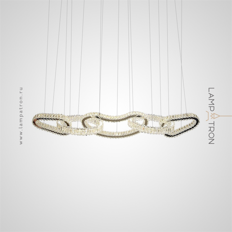 A series of in-line LED chandeliers in the form of a combination of interlocked rings of different diameters with crystal diffusers