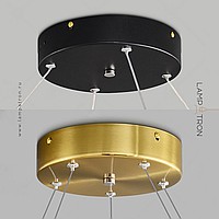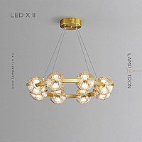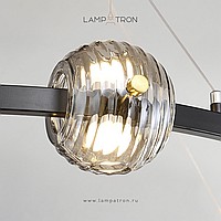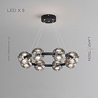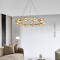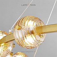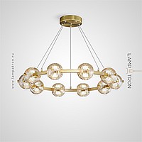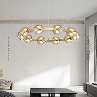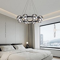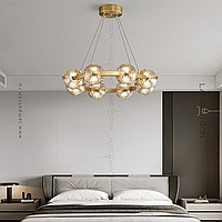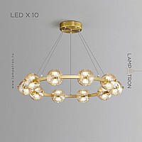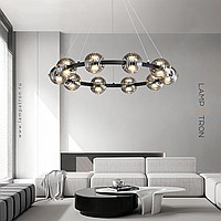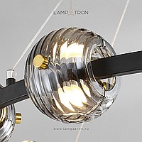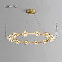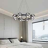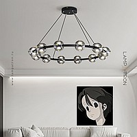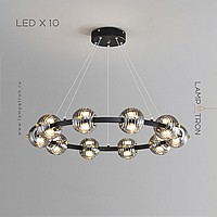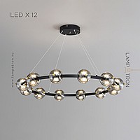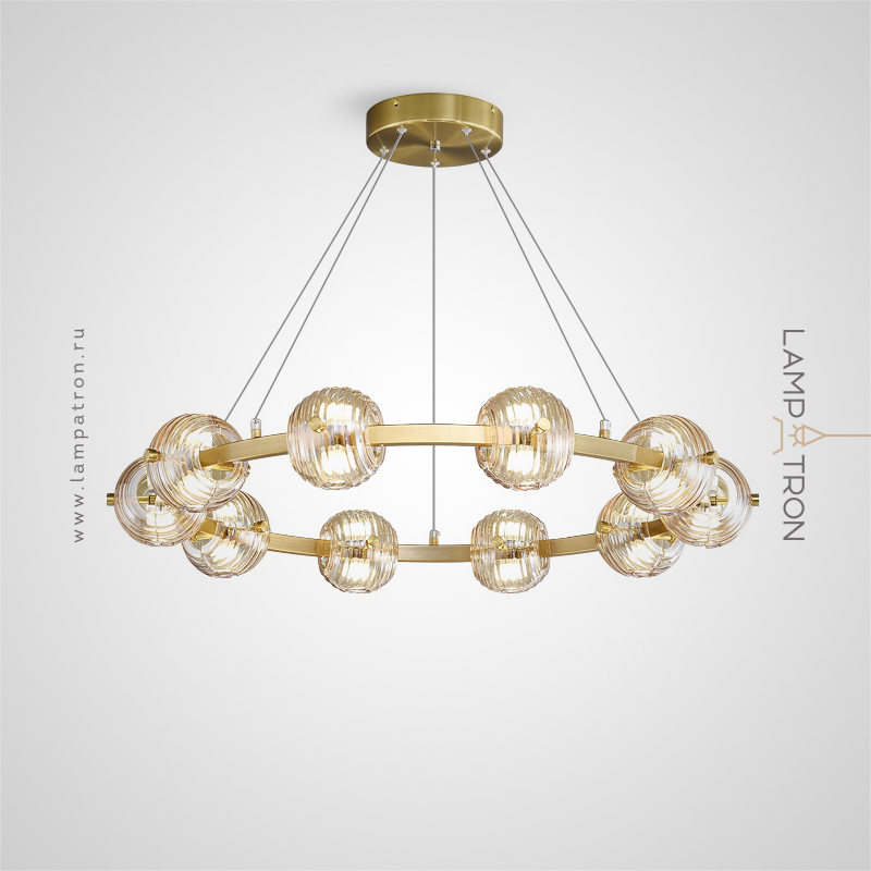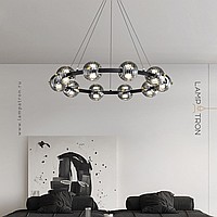 A series of ring LED chandeliers with point sources in spherical diffusers made of embossed glass
