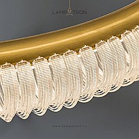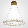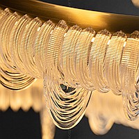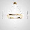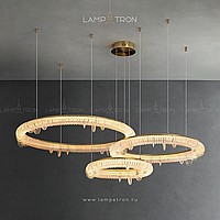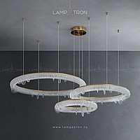 A series of LED chandeliers on string suspension with embossed lampshades in the form of ring -shaped pendants along the contour of the ring frame