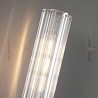 A series of sconces with glass relief shades of an elongated cylindrical shape