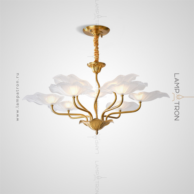 Chandelier with open glass ceiling in the form of stylized lotus leaves