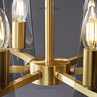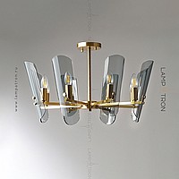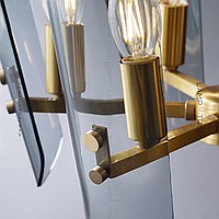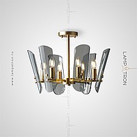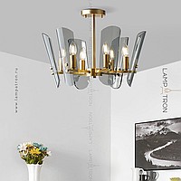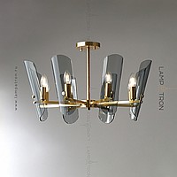 A series of ceiling chandeliers on a radial frame with curved glasses of glass with rounded edges