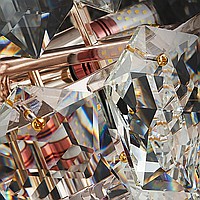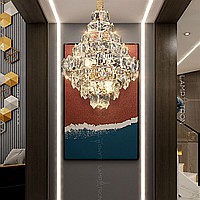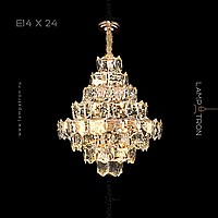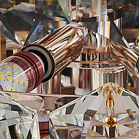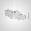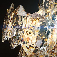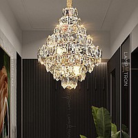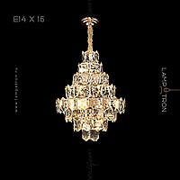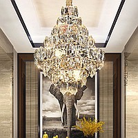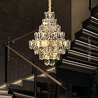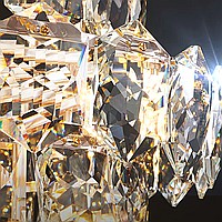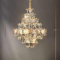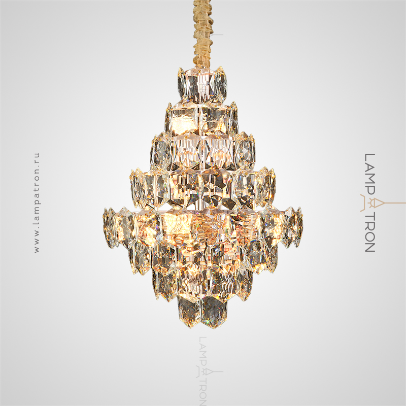 A series of designer chandeliers with a cascading lampshade of relief crystal pendants of a geometric shape
