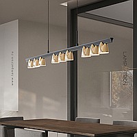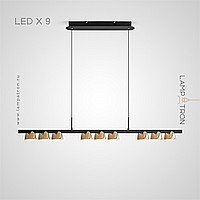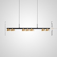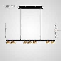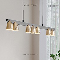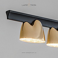 A series of slatted LED luminaires with diffusers in glossy brass color on a black rail