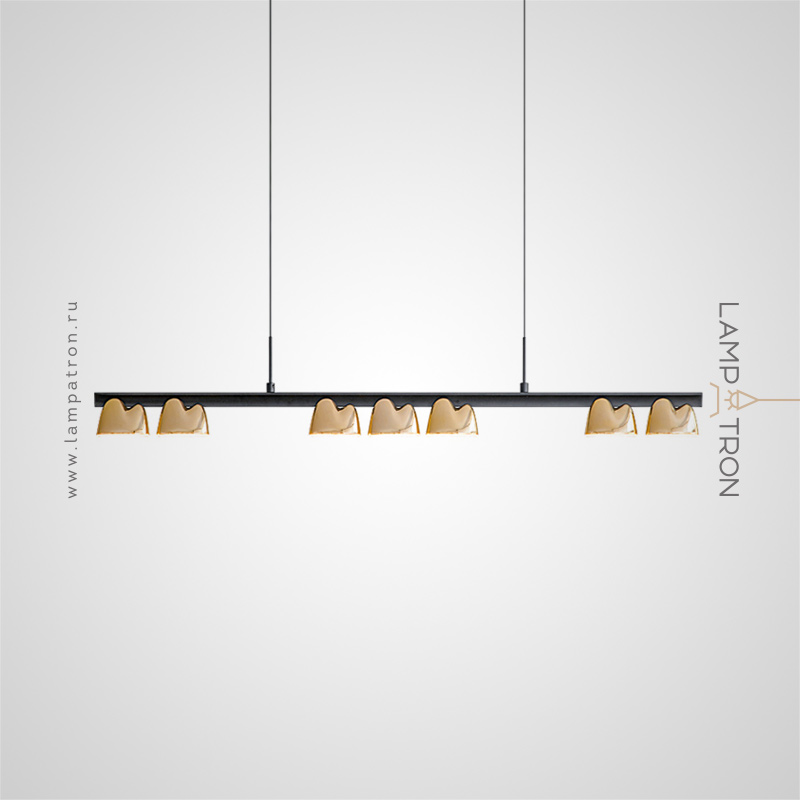 A series of slatted LED luminaires with diffusers in glossy brass color on a black rail