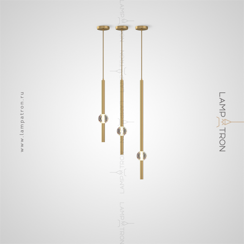 A series of pendant LED luminaires with crystal spherical shades on a cylindrical tubular body