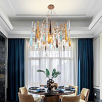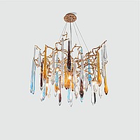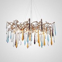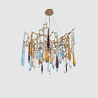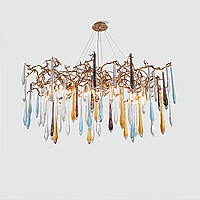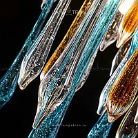 A line of chandeliers on a metal frame with transparent or multi-colored pendants in the form of drops