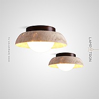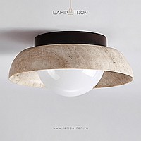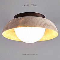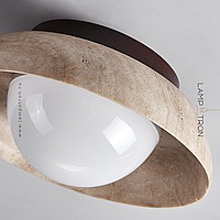 Ceiling lamp with a spherical shade under a stone lampshade in the shape of a bowl on a wooden mount