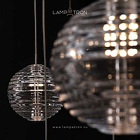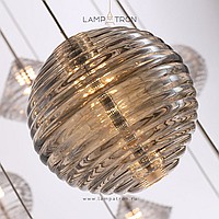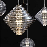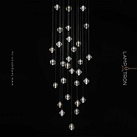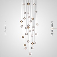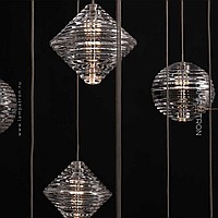 Cascade luminaire with a combination of 30-glass pendants in the shape of prisms and spheres with concentric relief