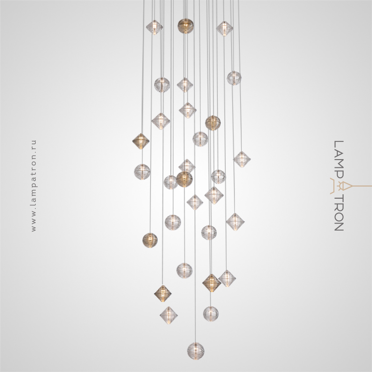 Cascade luminaire with a combination of 30-glass pendants in the shape of prisms and spheres with concentric relief