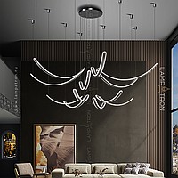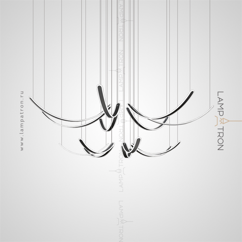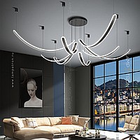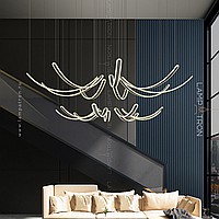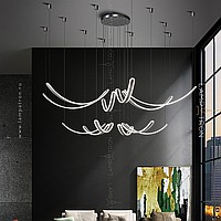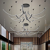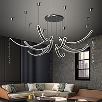 The finished combination of suspended LED lamps with elongated curved shades with rounded edges