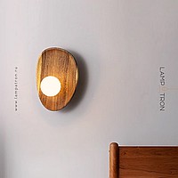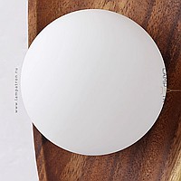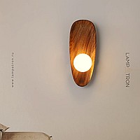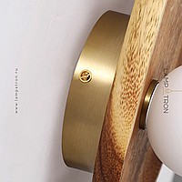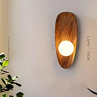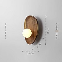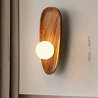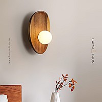 A series of wall lamps with a spherical dome made of milky glass on a rounded concave solid wood base