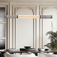 A series of slatted LED luminaires with cylindrical shades made of a combination of milk and tinted glass