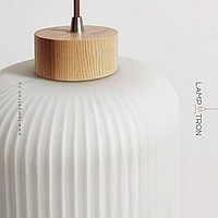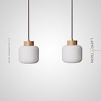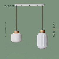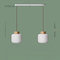 Ready-made combination of 2 pendant lamps with geometric shades made of embossed glass with wooden elements