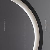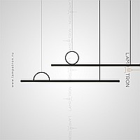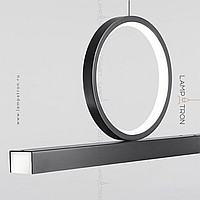 A series of LED-backlit slatted luminaires on the bottom of a black rectangular case with ring-shaped and half-ring décor