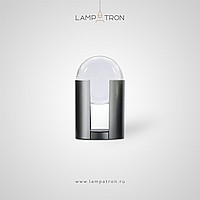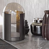 A table lamp in the form of a cylinder with a slot and an internal light source directed at a spherical glass lens
