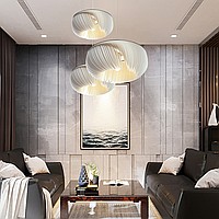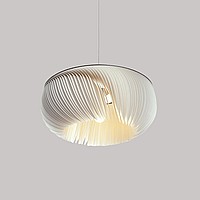 Designer chandelier with a lampshade from a fan of plastic sections that form a voluminous composition