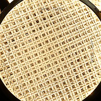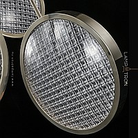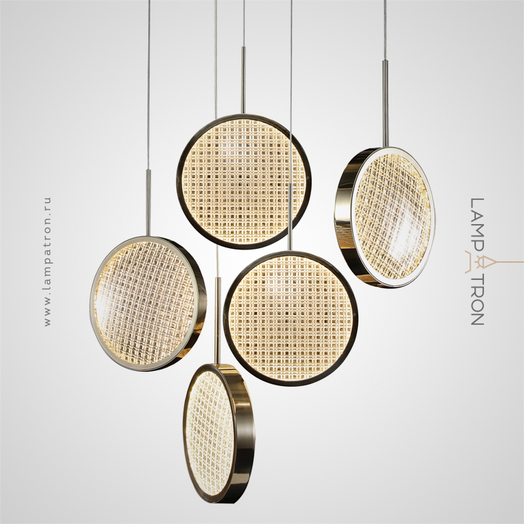 Combination of LED pendant lights with disc-shaped domes with double-sided glow made of handcrafted textured glass and additional downward-facing light sources