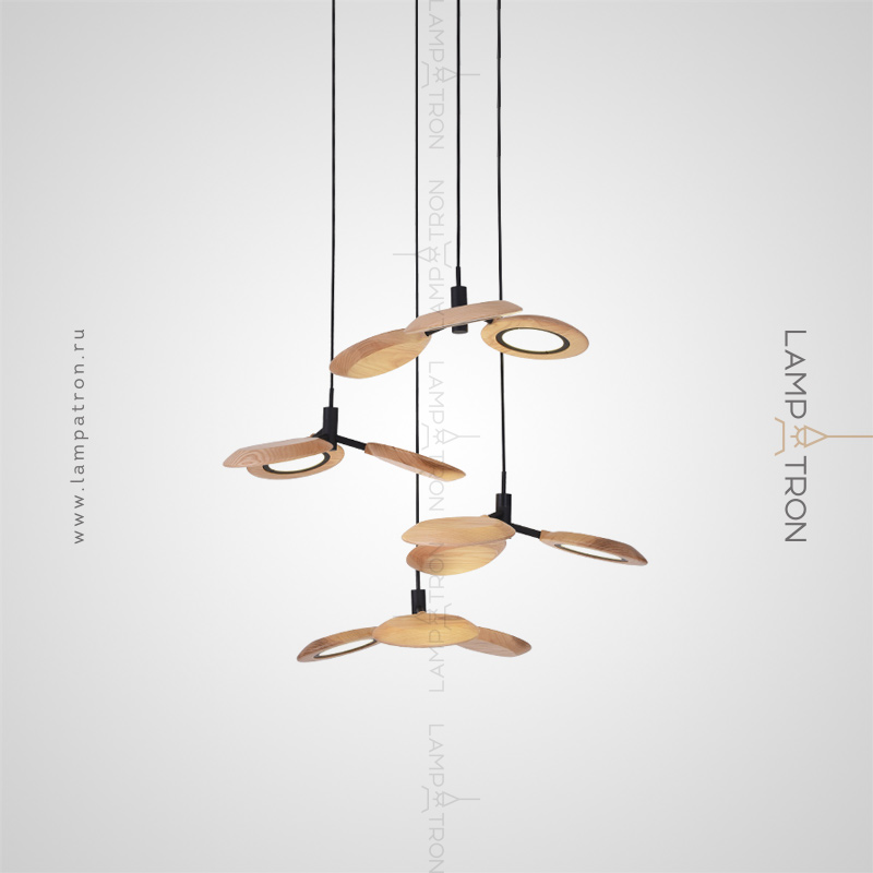 Ready -made combination of suspended lamps with three wooden ceiling in the form of blades