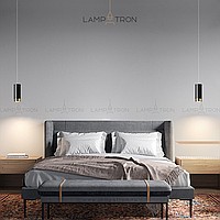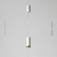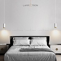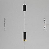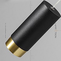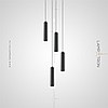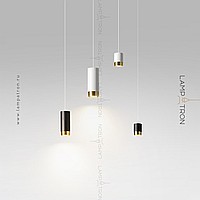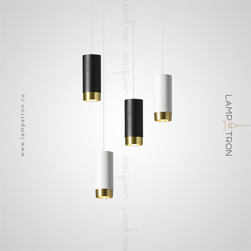 A series of suspended lamps with cylindrical metal ceilings of different heights