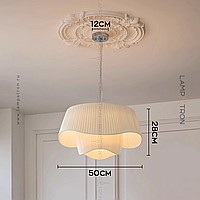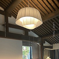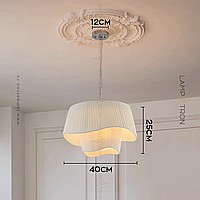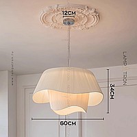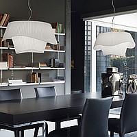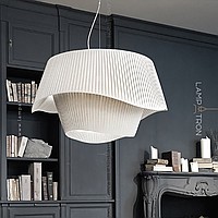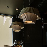 A series of designer chandeliers with a double relief lampshade in a wavy shape made of textile
