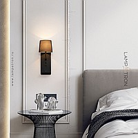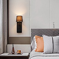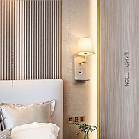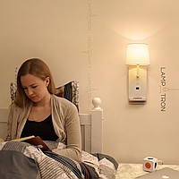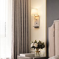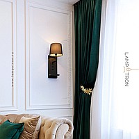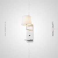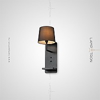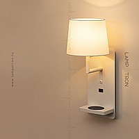 A series of wall lamps with a textile cylindrical lampshade on a rectangular base with an object shelf