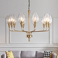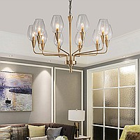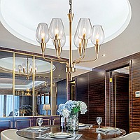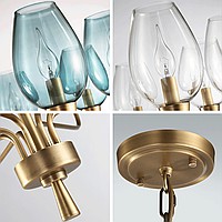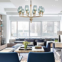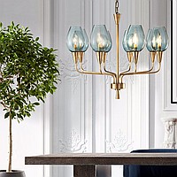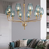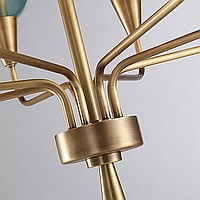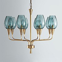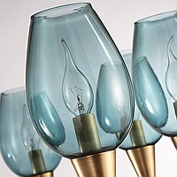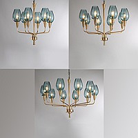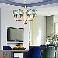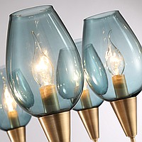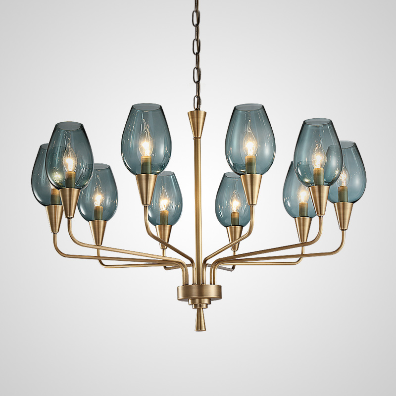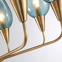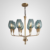 Art Nouveau chandelier with glass ceiling with a blue tint on an elegant radiation frame of a brass color