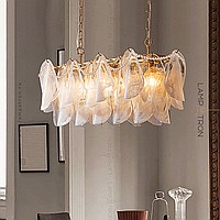 The lampshade of the chandelier is decorated with pearl beads.