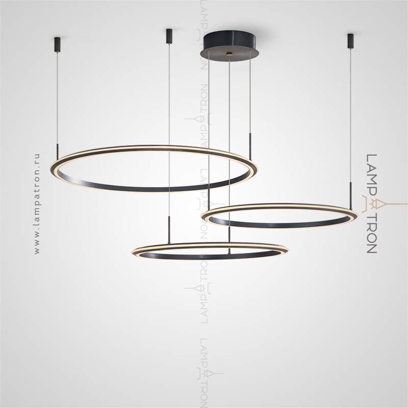 A series of ring LED chandeliers with LED lighting along the contour of the black matte case