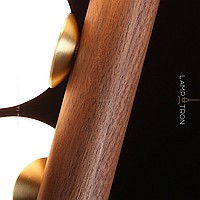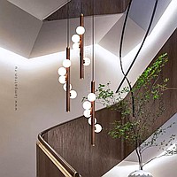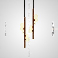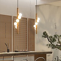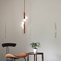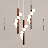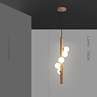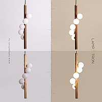 A series of suspended lamps with spherical matte plafonas on a wooden rack