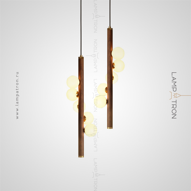 A series of suspended lamps with spherical matte plafonas on a wooden rack