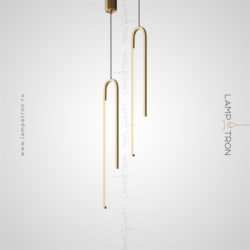 A series of suspended LED lamps with elongated rectangular LED panels on a multi-level arched case