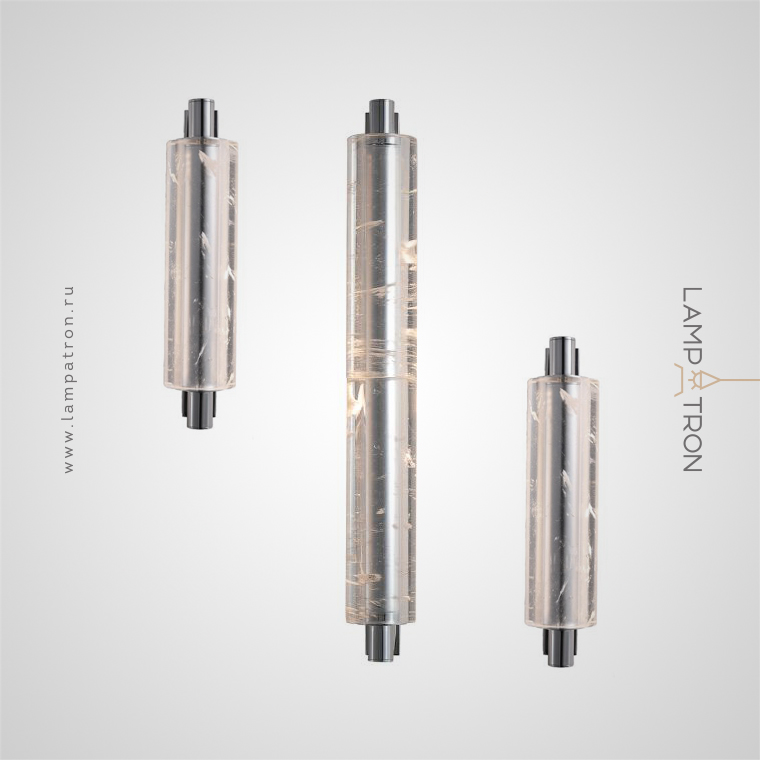 A series of wall lamps with cylindrical crystal glass shades with a pattern