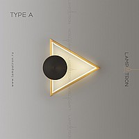 A series of LED wall lamps with a decorative disc on a brass case of geometric shape