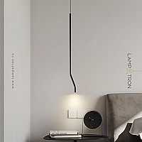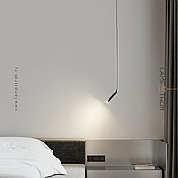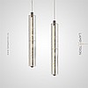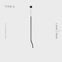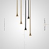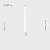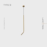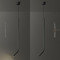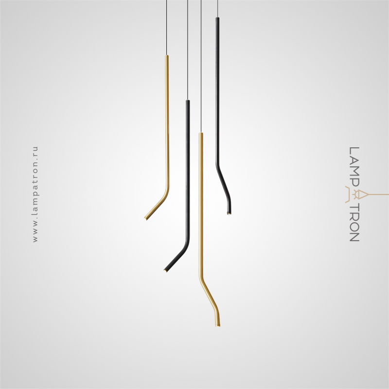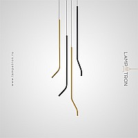 A series of LED pendant lights with a curved tubular body made of real and blackened brass